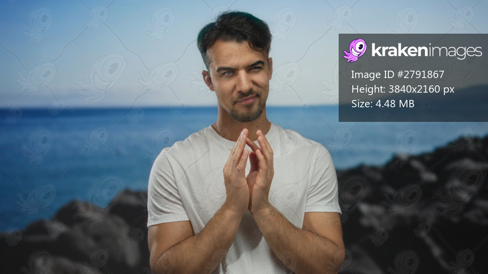 Young man at the seaside with contemplative expression, wearing casual white shirt against a serene beach background under clear blue sky.