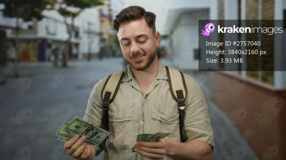 Young man with backpack and camera counts us dollars on a city street showcasing a focus on travel and adventure with a hint of financial security.