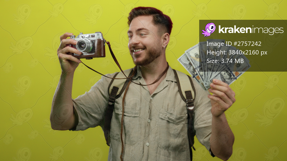 Young man with backpack and camera smiles holding us dollars against vibrant yellow background suggesting successful travel photography experience