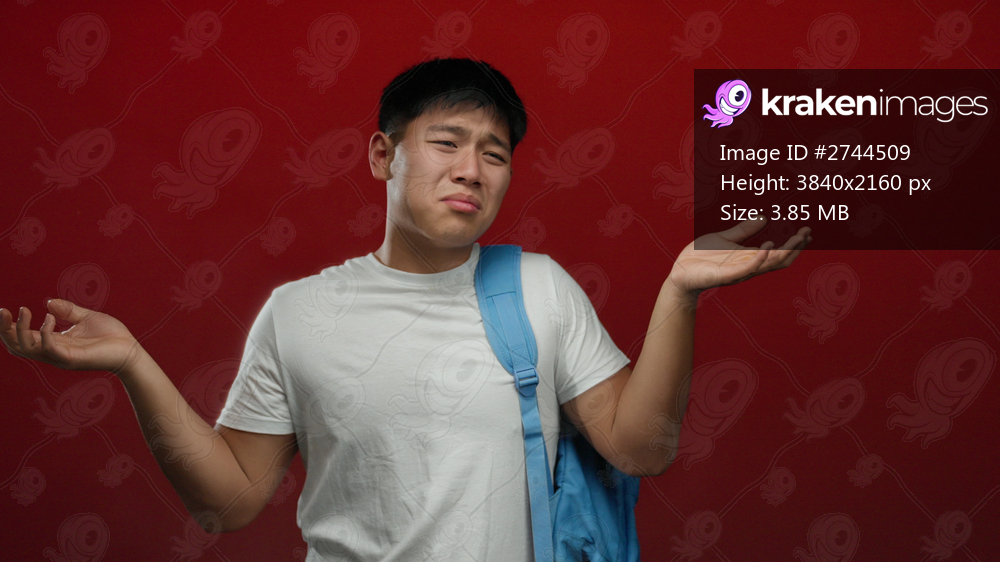 Young man with backpack gesturing on red background suggestively expressing confusion or uncertainty in a relaxed, isolated setup.