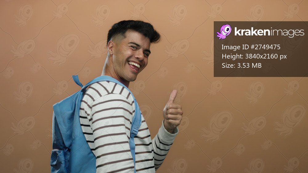 Young man with backpack smiling and giving thumbs up against an isolated brown wall, exuding a cheerful and confident demeanor in a casual setting.