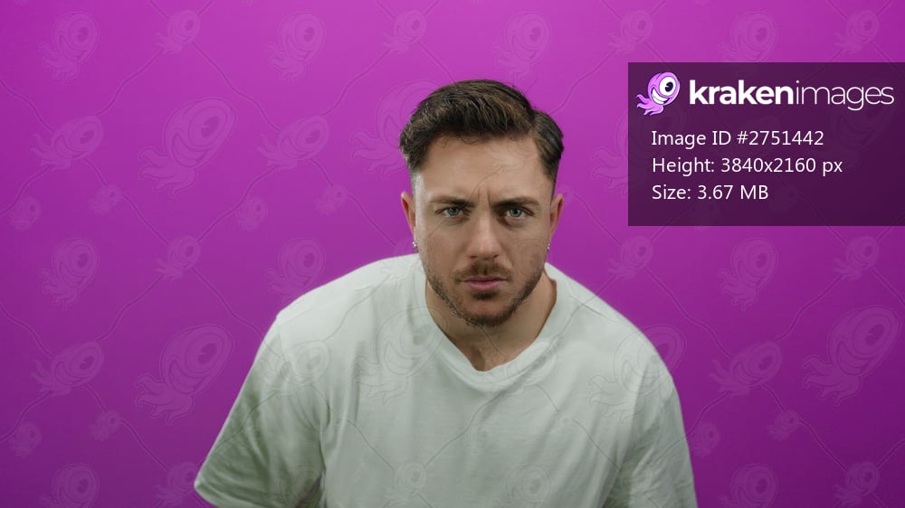 Young man with beard against isolated vibrant pink background wearing white tshirt