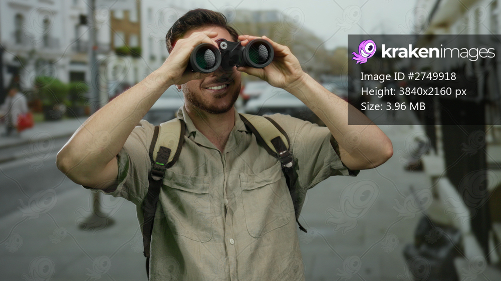 Young man with beard and backpack using binoculars to explore a city street, capturing the essence of urban tourism and outdoor adventure.