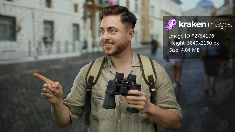 Young man with beard and binoculars smiles on city street pointing while wearing backpack conveying tourist adventure setting on a sunny day outdoors
