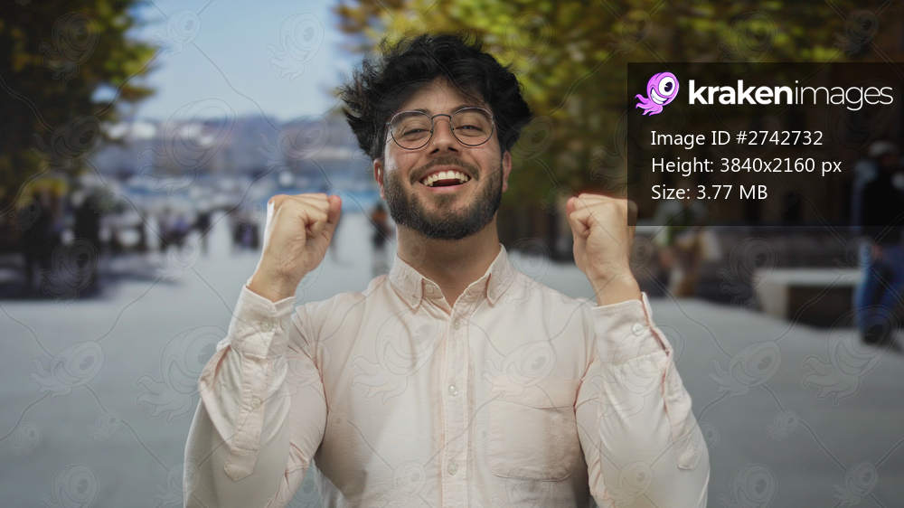 Young man with beard celebrating outdoors on a sunny street, wearing glasses and a white shirt, exuding happiness and success.
