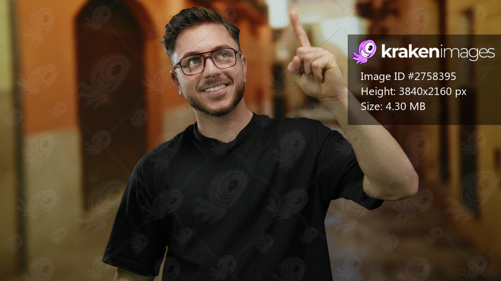 Young man with beard cheerfully pointing upward on a vibrant city street, exuding confidence and engaging charm in casual attire amid urban backdrop.