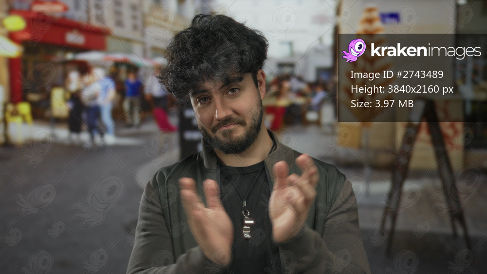 Young man with beard clapping on a bustling street with blurred people and vibrant outdoor cafes in the background