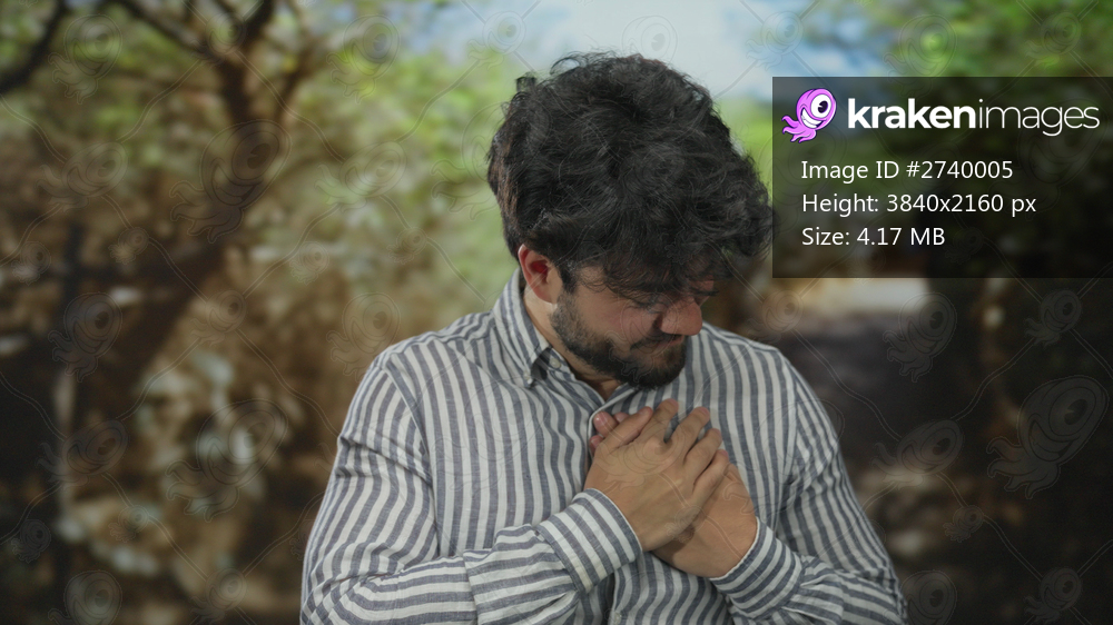Young man with beard clutching chest in a park, possibly experiencing heart discomfort, surrounded by green trees and dappled sunlight, appearing distressed. - Kraken Images