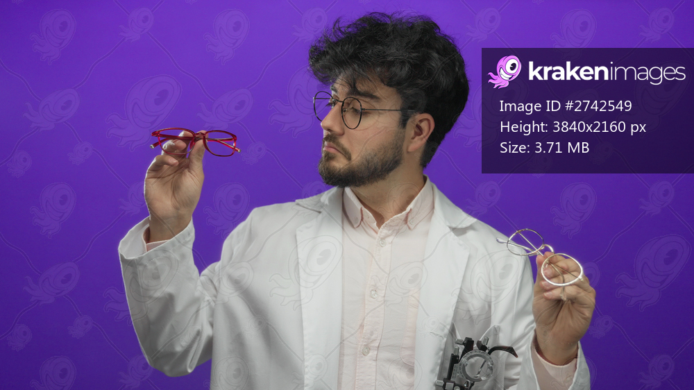 Young man with beard comparing eyeglasses in lab coat, against purple background, examining optics professionally with thoughtful expression and modern style. - Kraken Images