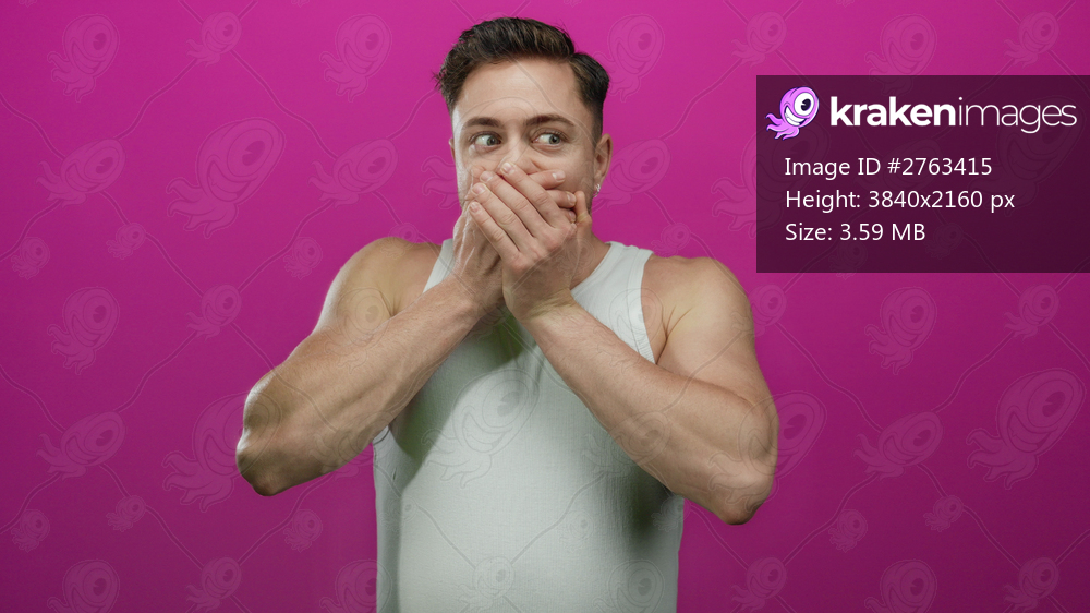 Young man with beard covers mouth with hands, standing against vibrant pink wall in isolated setting, expressing shock and surprise through body language and facial expression. - Kraken Images