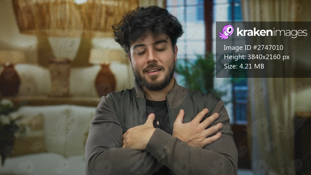 Young man with beard crossing arms in cozy hotel room with warm lighting and elegant decor, embodying comfort and relaxation in an inviting indoor setting. - Kraken Images