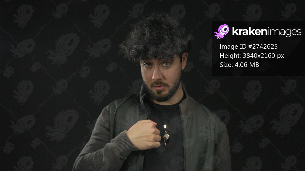 Young man with beard and curly hair gestures expressively against a black background, showcasing a playful and thoughtful demeanor in a dark jacket and casual attire. - Kraken Images