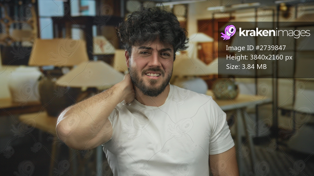 Young man with beard feeling neck discomfort in a lamp shop surrounded by various lighting fixtures and showcasing a mix of frustration and pain indoors. - Kraken Images