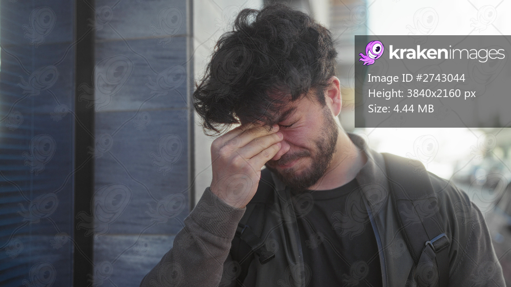 Young man with beard frustrated outdoors on sunny day covering face with hand exuding stress in urban setting against modern building backdrop.