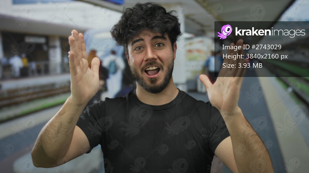 Young man with beard gestures expressively at outdoor train station bustling with activity on a busy day.