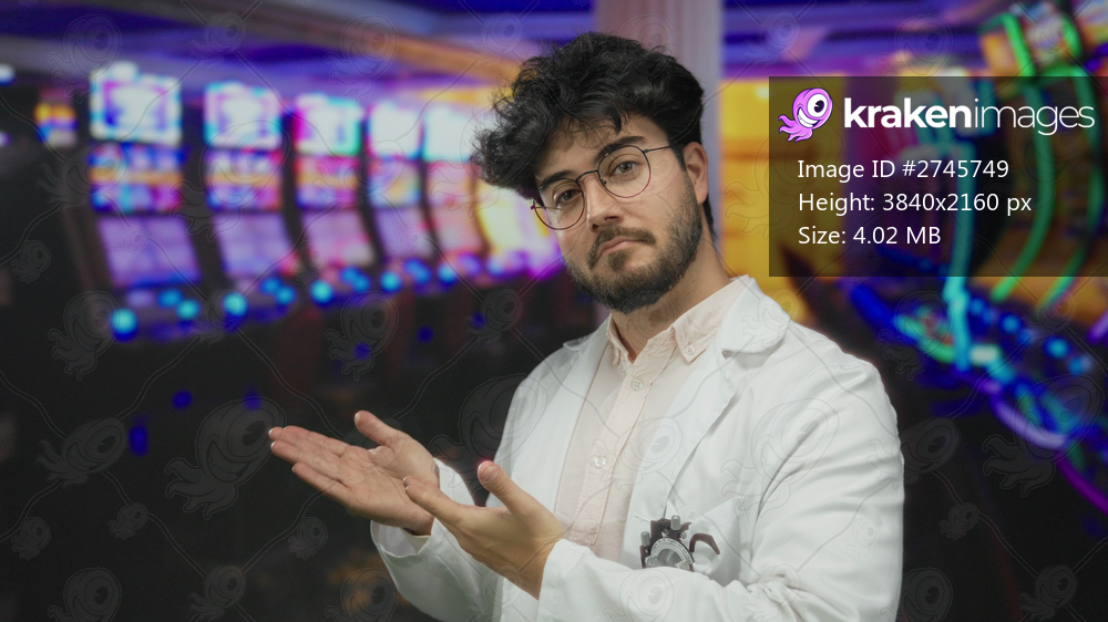 Young man with beard gestures in a vibrant indoor casino setting with colorful slot machines in the background, showcasing excitement in the lively atmosphere. - Kraken Images