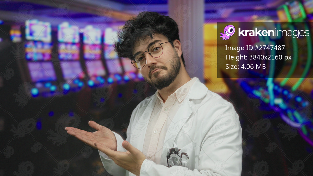 Young man with beard gestures in a vibrant indoor casino setting with colorful slot machines in the background, showcasing excitement in the lively atmosphere. - Kraken Images