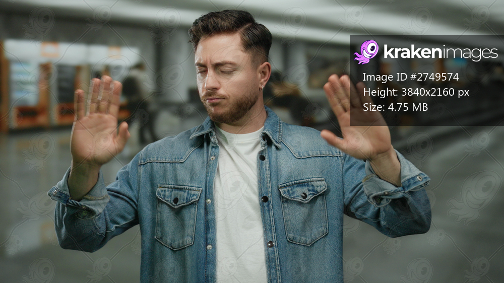 Young man with beard gestures indoors at an airport terminal under bright lights with vending machines and smooth gray flooring in the background suggesting travel. - Kraken Images