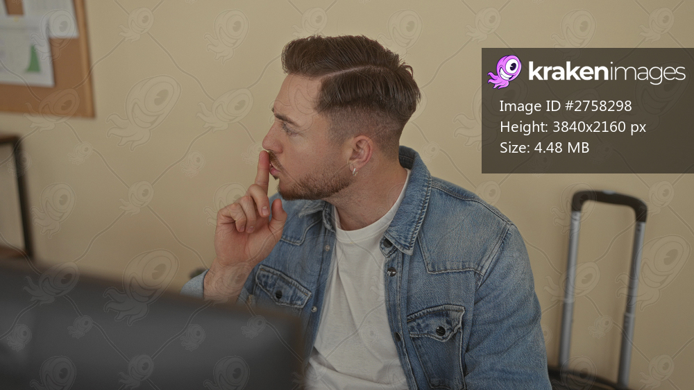 Young man with beard gestures silence and covers ears at office desk in indoor workplace setting.