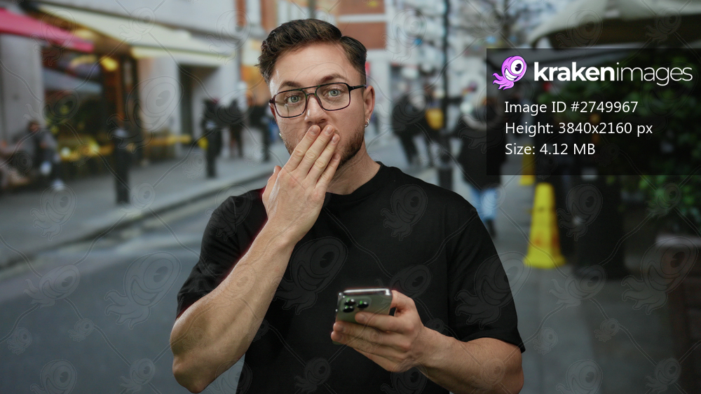 Young man with beard gestures to camera while holding phone on vibrant city street, exuding confidence and a casual vibe amidst bustling outdoor setting. - Kraken Images