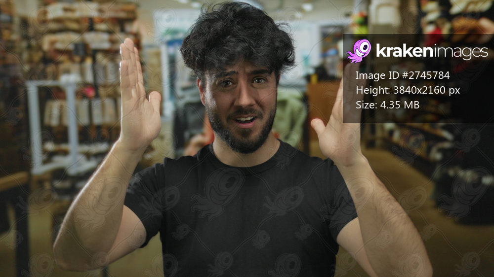 Young man with beard gesturing indoors at a bazaar with a frustrated expression, capturing the essence of emotion and energy in a busy market setting.