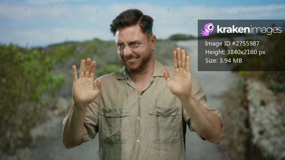 Young man with beard gesturing outdoors in park on sunny day, conveying emotion as he stands confidently in front of vibrant natural landscape, suggesting a carefree lifestyle. - Kraken Images
