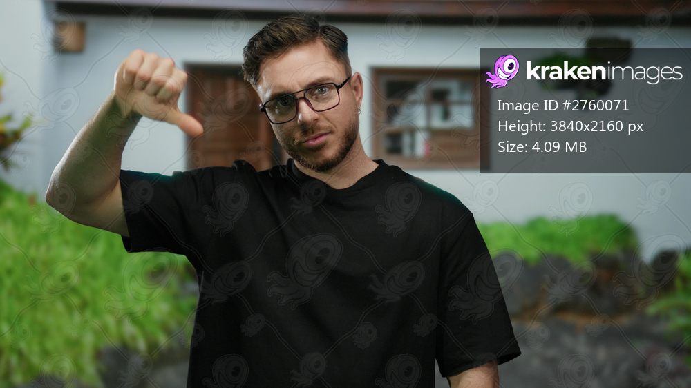 Young man with beard gives thumbs up and down on a city street outdoor scene, wearing glasses and black shirt, expressing mixed emotions in an urban environment. - Kraken Images