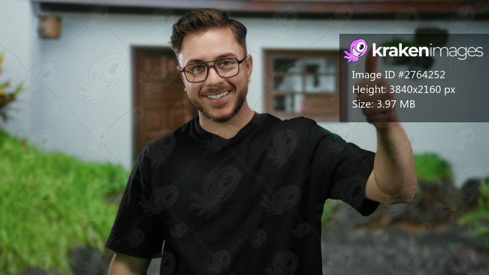Young man with beard gives thumbs up and down on a city street outdoor scene, wearing glasses and black shirt, expressing mixed emotions in an urban environment. - Kraken Images
