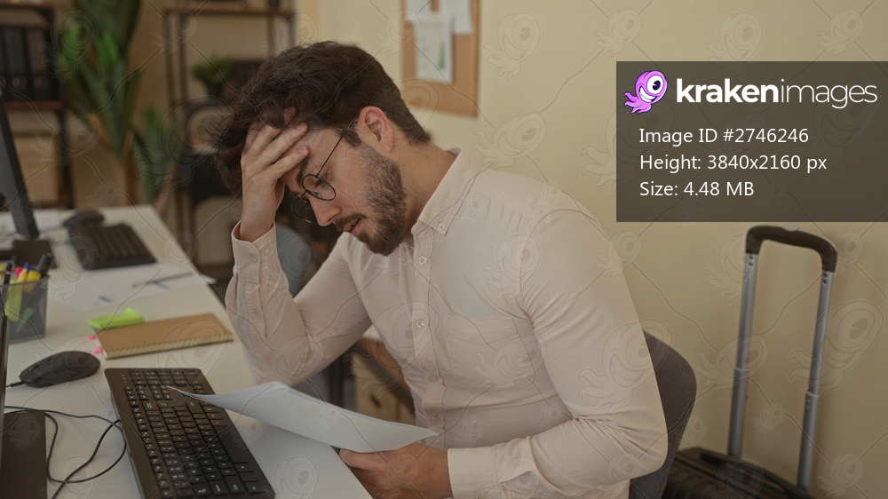 Young man with beard and glasses appears worried, reading documents in modern office, surrounded by tech, books, and greenery, conveying stress in professional setting. - Kraken Images