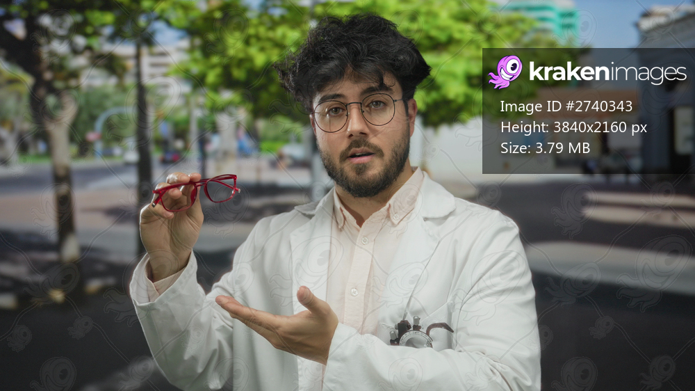 Young man with beard and glasses in a white coat holding red glasses outdoors on a sunny street with trees and buildings in the background.