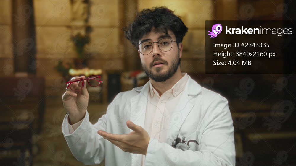 Young man with beard and glasses in a white coat holds red glasses inside a church, blending modern and sacred symbolism in a serene, ambient setting.