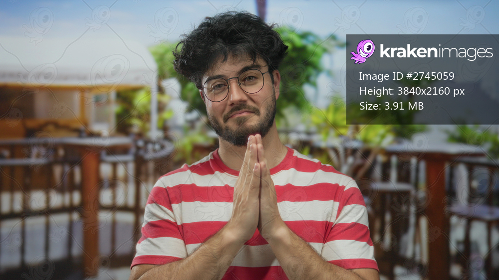 Young man with beard and glasses in red striped shirt stands with joined hands on an outdoor restaurant terrace with lush greenery and wooden railings. - Kraken Images