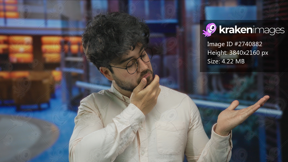 Young man with beard and glasses inside hotel extends hand while pondering, surrounded by modern indoor furnishings, evoking a thoughtful ambiance.