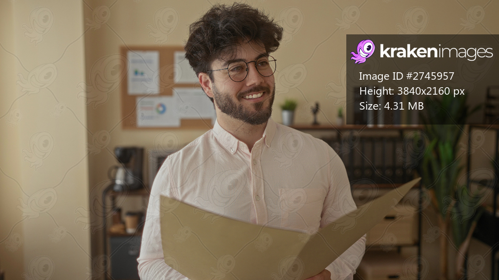 Young man with beard and glasses reading a document in a well-lit office with plants and shelves, reflecting a professional and focused atmosphere.