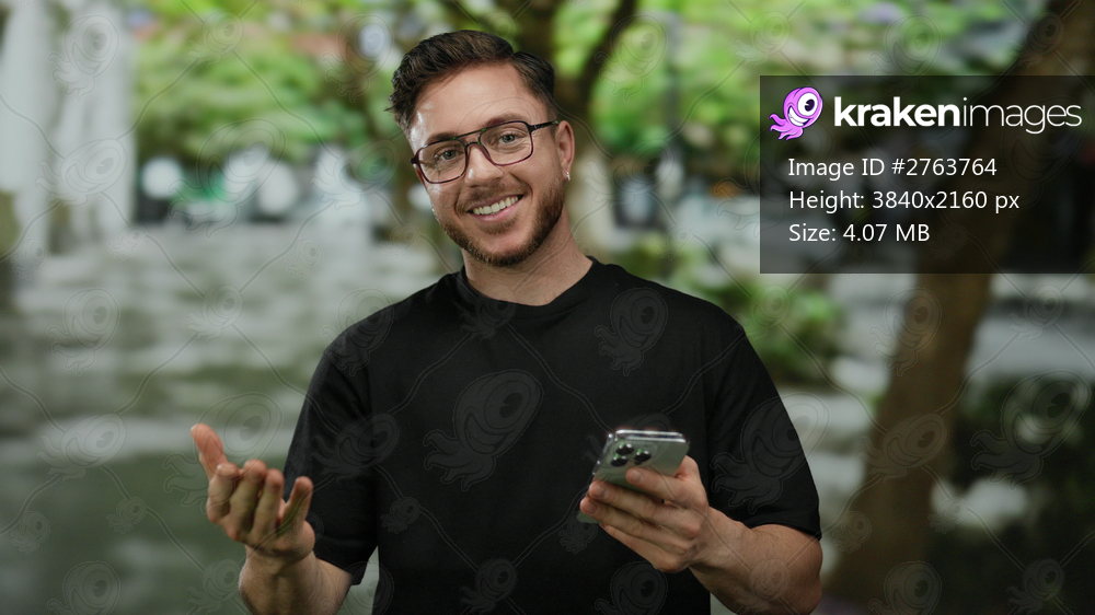 Young man with beard and glasses smiles while looking at smartphone on city street, enjoying outdoor urban setting with trees in background.