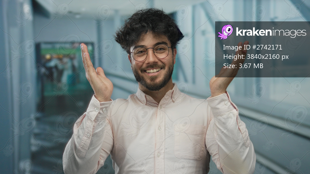 Young man with beard and glasses smiling indoors at an airport, illustrating travel ambiance and excitement in a contemporary setting.