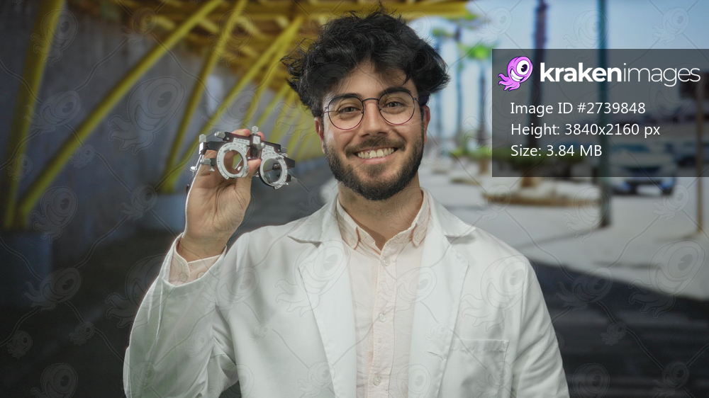Young man with beard and glasses smiling outdoors in a street setting, wearing a white coat and holding an optometry tool, under sunny skies.