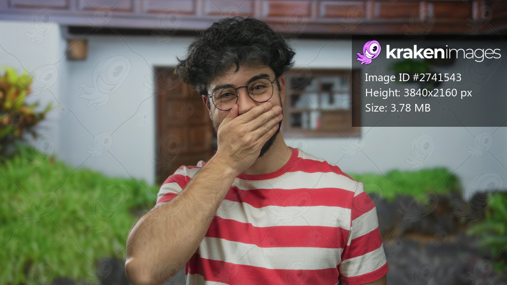 Young man with beard and glasses smiling outdoors on a sunny day wearing a striped shirt with greenery and a house in the background.