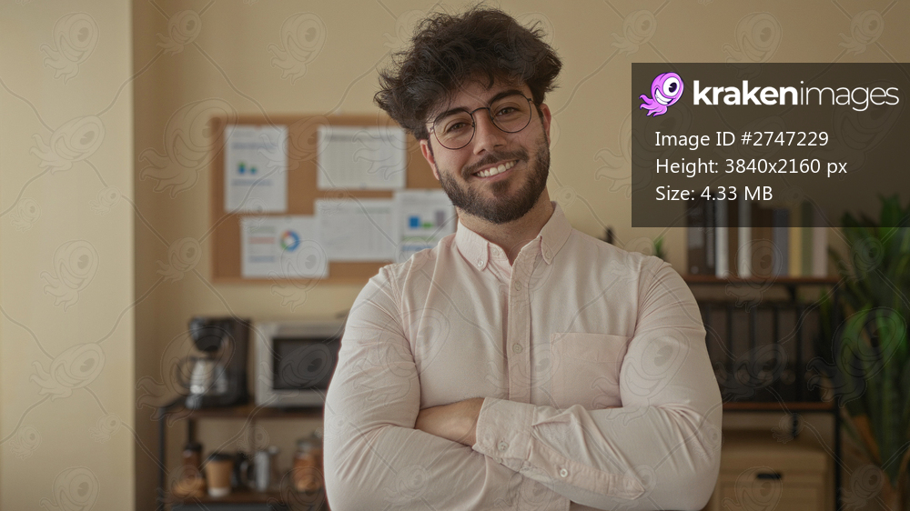 Young man with beard and glasses standing confidently in an office with charts on the wall and plants adding a touch of greenery to the indoor workspace. - Kraken Images