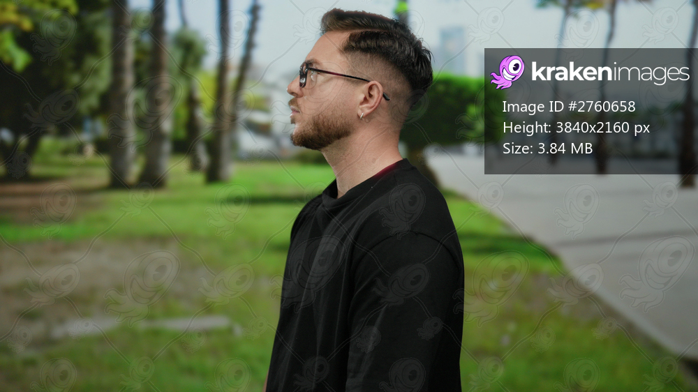 Young man with beard and glasses standing in outdoor park setting surrounded by trees symbolizing relaxation and natural environment in alignment with nature - Kraken Images