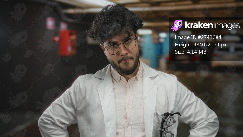 Young man with beard and glasses standing indoors in a parking lot wearing a white lab coat, looking focused and thoughtful in an academic setting