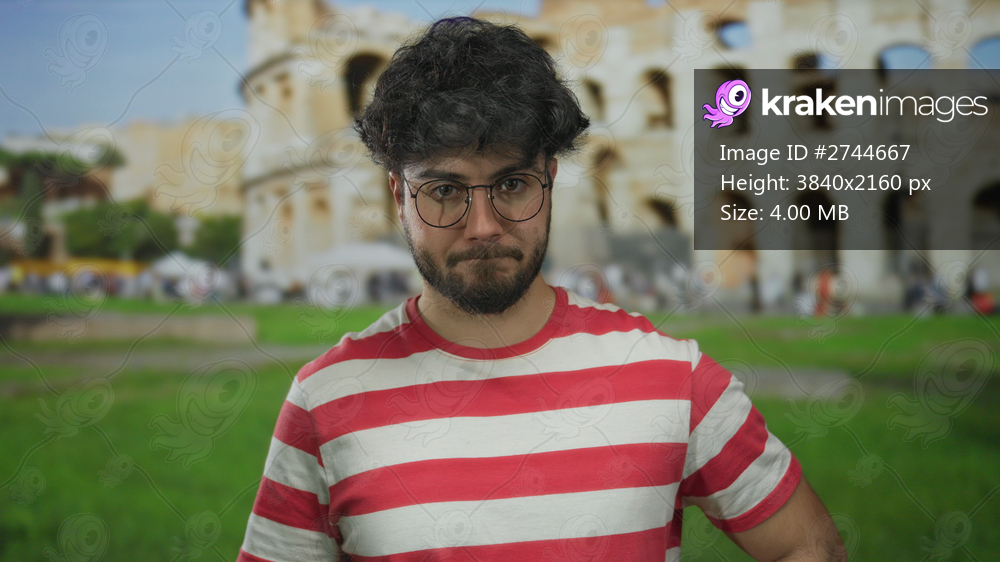 Young man with beard and glasses standing outdoors at the roman coliseum on a sunny day.