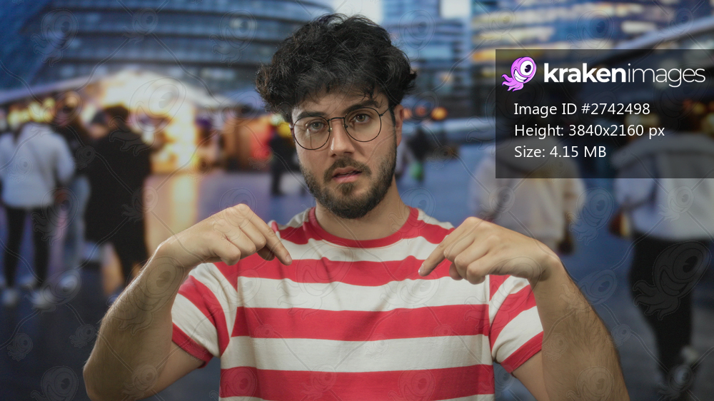 Young man with beard and glasses standing outdoors on a bustling street pointing downwards, wearing a striped shirt with blurred people and cityscape background. - Kraken Images