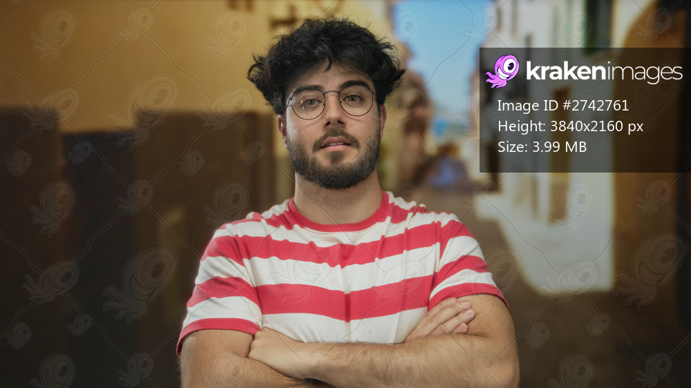 Young man with beard and glasses stands confidently with arms crossed in an outdoor street setting wearing a red and white striped shirt, conveying a relaxed and casual vibe. - Kraken Images