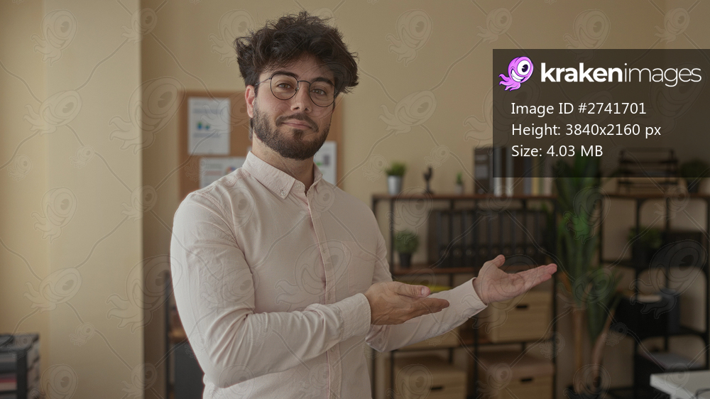 Young man with beard and glasses stands in a modern office, gesturing with confidence, surrounded by books and plants, presenting in a professional indoor environment. - Kraken Images
