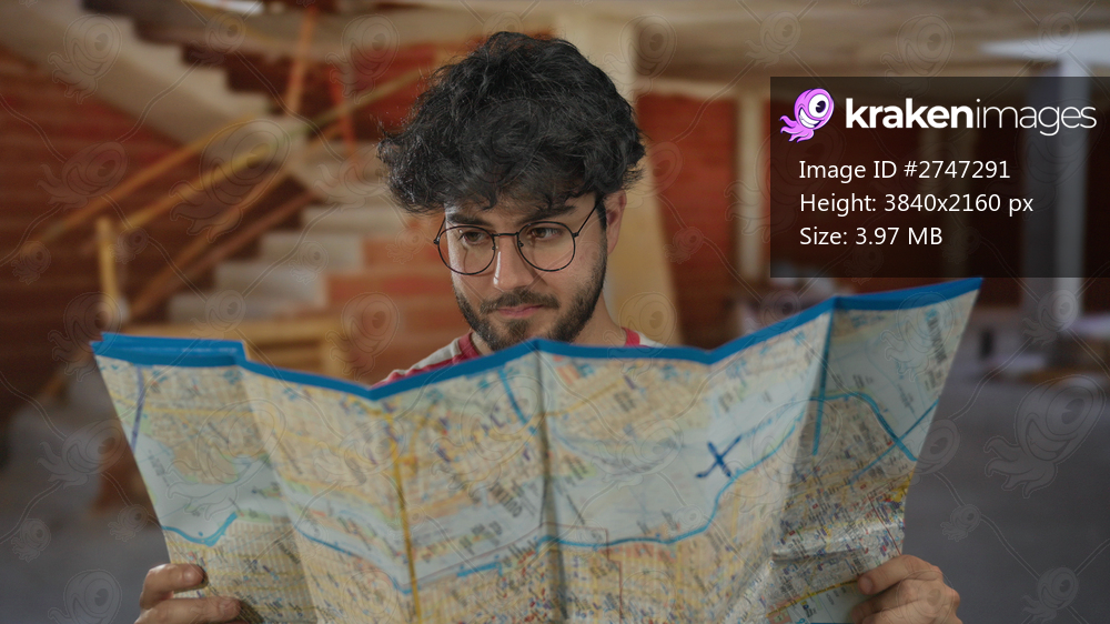 Young man with beard and glasses studies a map inside a construction site, focusing intently while surrounded by brick and concrete walls and an unfinished staircase. - Kraken Images
