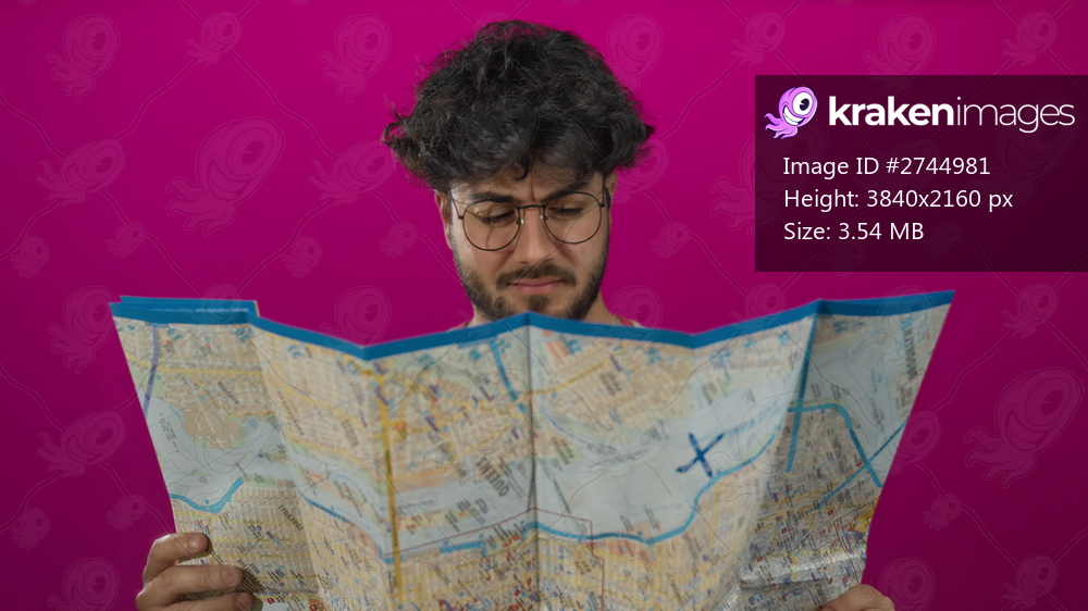Young man with beard and glasses studying a map against a vibrant pink background, portraying curiosity and exploration.