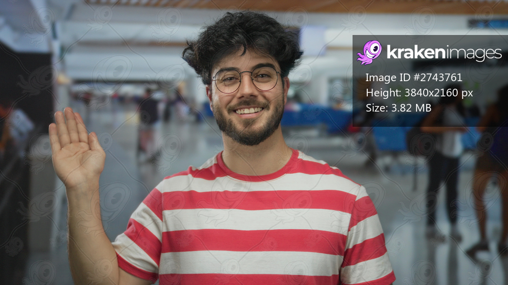 Young man with beard and glasses, wearing a striped shirt, waving at the camera in a busy indoor airport setting with blurred travelers in the background. - Kraken Images