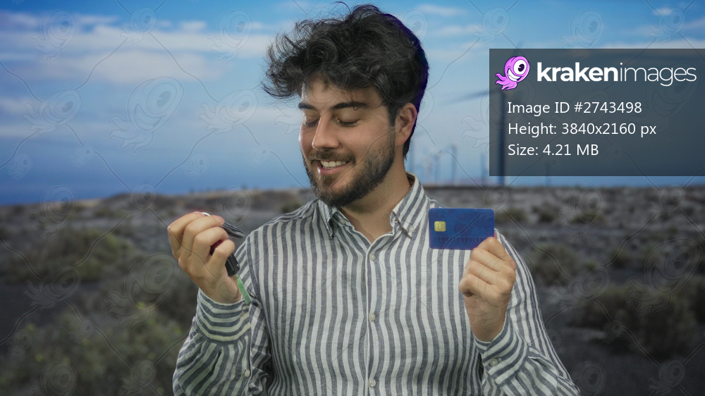 Young man with beard holding car keys and credit card standing outside in front of windmill field under blue sky suggesting eco-friendly technology and financial freedom focus - Kraken Images