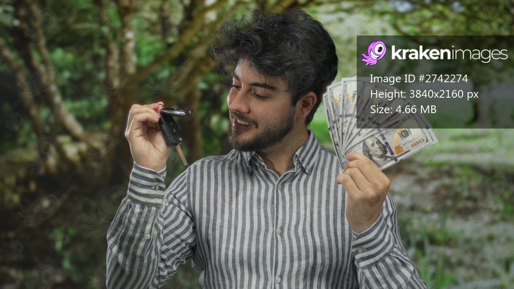 Young man with beard holding car keys and us dollar bills, smiling in a lush park, showcasing financial success outdoors.